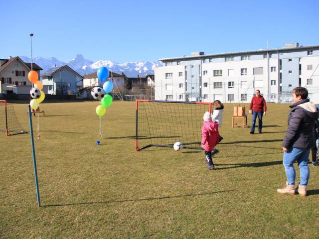 Die Idee bestand schon längere Zeit, nun konnte sie in die Tat umgesetzt werden. Um die Fussballtore auch gleich gebührend einzuweihen, hatten alle anwesenden Schülerinnen und Schüler die Möglichkeit, einen Fussball durch einen kleinen Slalom zu dribbeln und einen Treffer in eines der Tore zu versuchen. Von frenetischen Rufen angefeuert, versuchten die 180 anwesenden Schülerinnen und Schüler ihr Glück. Zum Dank wurden sie mit grossem Jubel und mit einem Laugenbrötli in Fussball-Form belohnt.