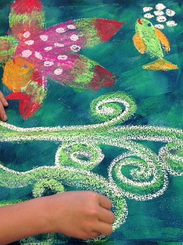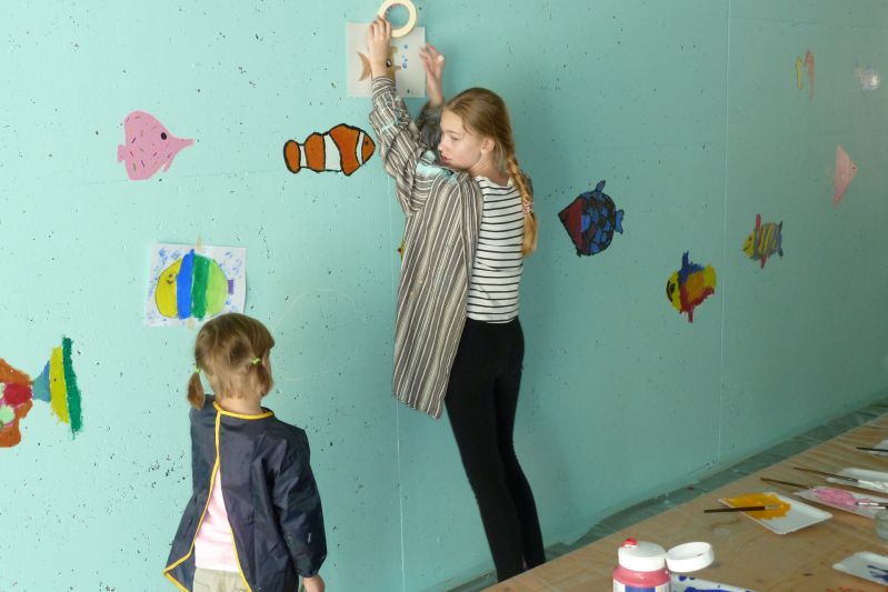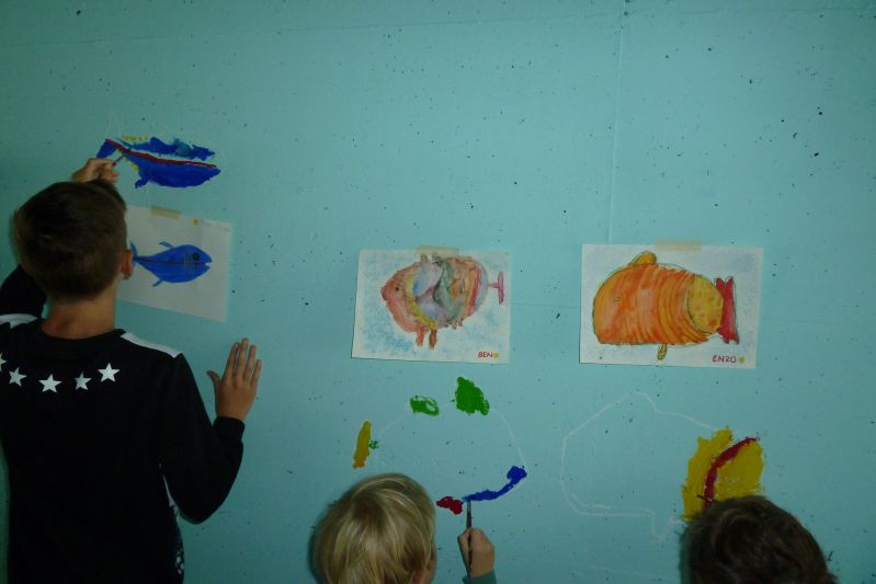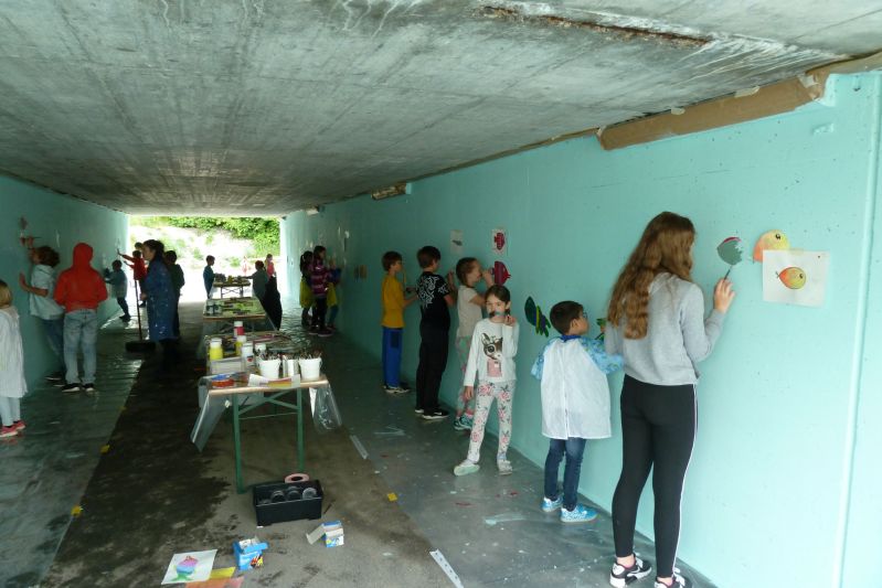 Die Kinder halfen sich klassenübergreifend; die grossen grundierten die Wand der Unterführung, die kleinen verwandelten sie mit ihren bunten Fischen in eine richtige Unterwasserwelt. Die Fische wurden im hauseigenen Atelier aber auch im Kleemuseum unter der Anleitung von KunstpädagogInnen zum Leben erweckt.