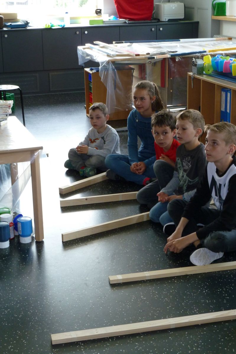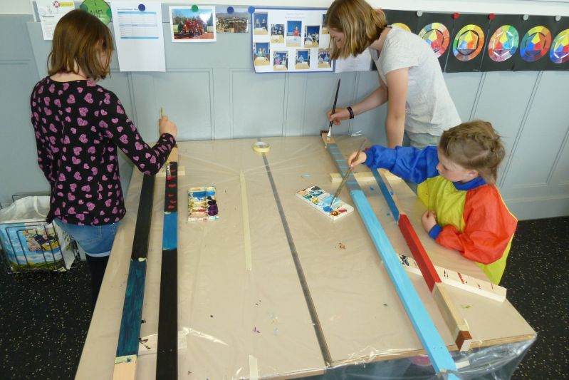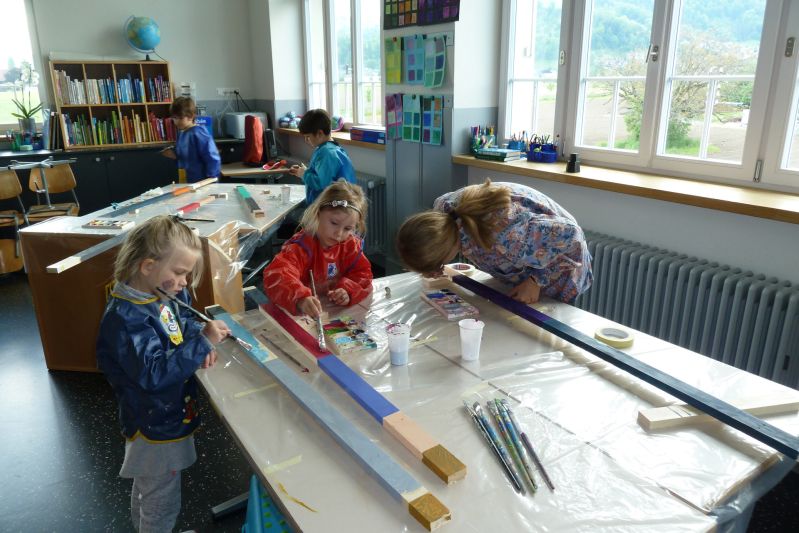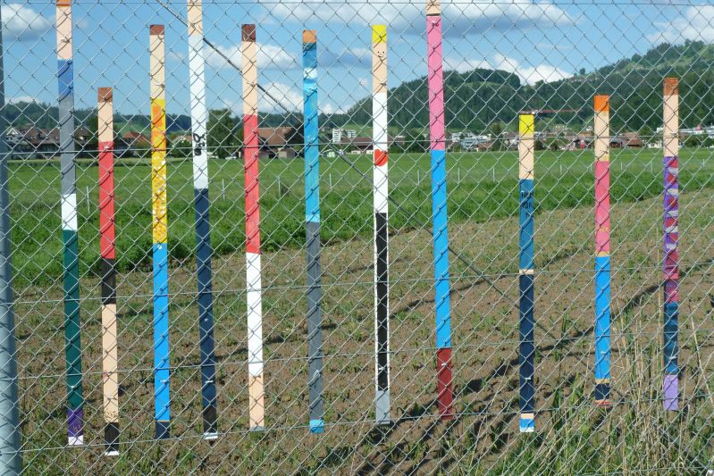 Die Kinder konnten sich auch in Form von Holzlatten verewigen, die auf ihre Grösse zugeschnitten und in der Farbe ihrer Kleidung bemalt wurden. Diese Momentaufnahmen wurden am Zaun des Schulhausareals und des Kindergartens befestigt.