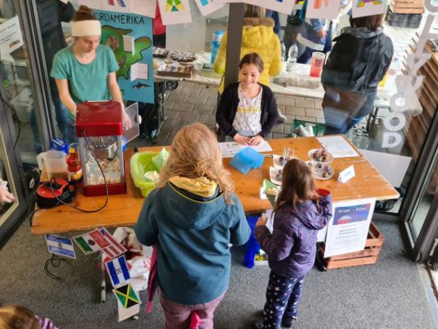 Während drei Tagen durften alle Kinder von Kindergarten bis 4. Klasse auf einen selbstgewählten Kontinent reisen und diesen in den klassendurchmischten Gruppen besser kennenlernen. Dabei wurde bereits fleissig für den Weltmarkt am Abschlusstag gearbeitet.