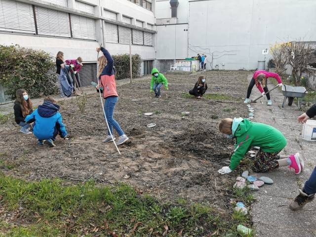 Den Mittwochmorgen haben alle im Schulgarten verbracht. Etliche Arbeiten mussten erledigt werden, um einerseits den Garten auf das neue Gartenjahr vorzubereiten, andererseits durften die Kinder auch kreativ werden, um ihre eigenen Spuren im Garten zu hinterlassen.