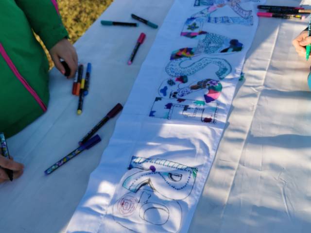 Sonnensegel wurde bemalt, welches dann im Sommer über den Arbeitstischen