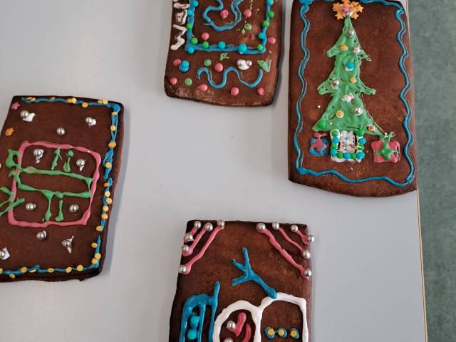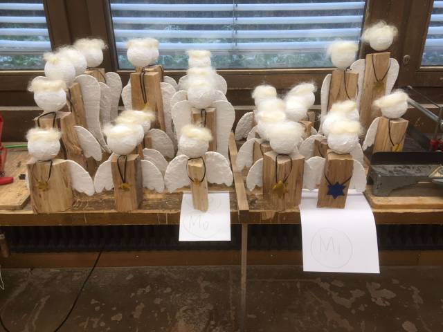 Anschliessend wurde in den Workshops fleissig Deko hergestellt, um das Schulhaus zu schmücken: Im Werkraum entstanden in Teamwork riesige Tannenbäume, für welche in einem anderen Workshop Baumschmuck gebastelt wurde. Die Kinder konnten auch Kerzen ziehen und Lebkuchen backen und verzieren. Holzengel verzieren nun hoffentlich mehrere Haushalte in Steffisburg.
