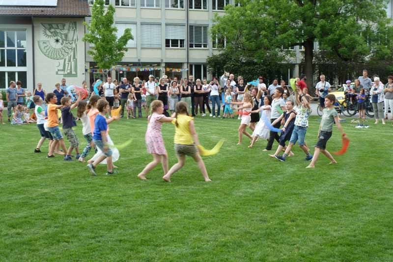 An verschiedenen Orten wurden den Besuchern diverse tolle musikalische Vorstellungen dargeboten. Zudem konnten die Gäste in jedem Schulzimmer und Kindergarten Einblicke in den Schulalltag gewinnen. Zwei fetzige Tanzeinlagen der 2. und 4. Klasse rundeten die Feier bei sommerlichem Wetter auf der Schulhausanlage ab.