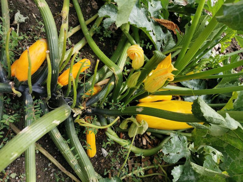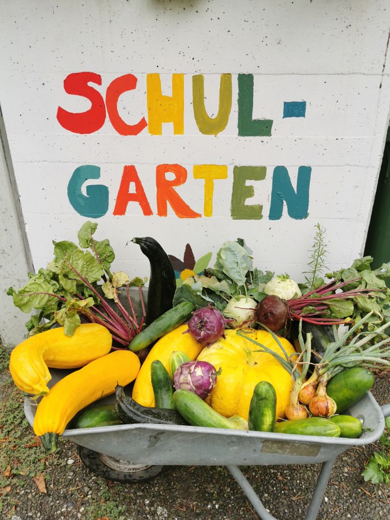Während der Sommerferien sorgte ein Bewässerungscomputer dafür, dass nicht täglich von Hand gewässert werden musste - allerdings wurden sonst keine Arbeiten verrichtet. Die Schülerinnen und Schüler staunten sehr, als sie nach 5 Wochen Ferien zum ersten Mal wieder im Garten waren. Überall grünte und blühte es, Kürbisse und Zucchetti waren unglaublich gewachsen, alle Tomatenpflanzen trugen erste, noch grüne Tomaten und der Mais war grösser als wir Lehrpersonen. Gleichzeitig war aber auch alles von Unkraut überwuchert. Vier Lektionen lang wurde gejätet und geerntet, eine Schubkarre voller Gemüse durften wir ins Schulhaus bringen.
