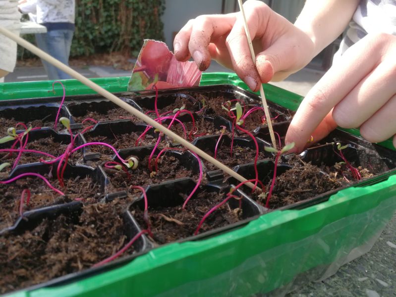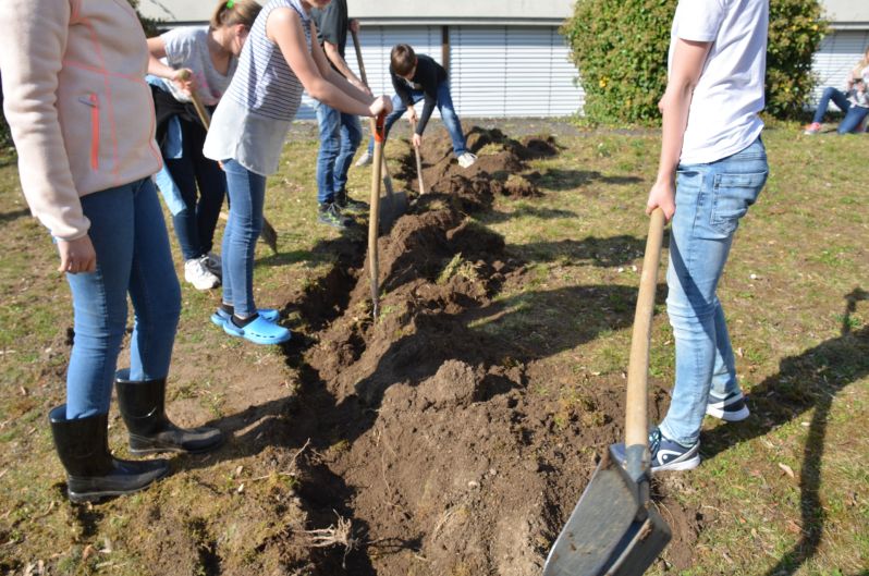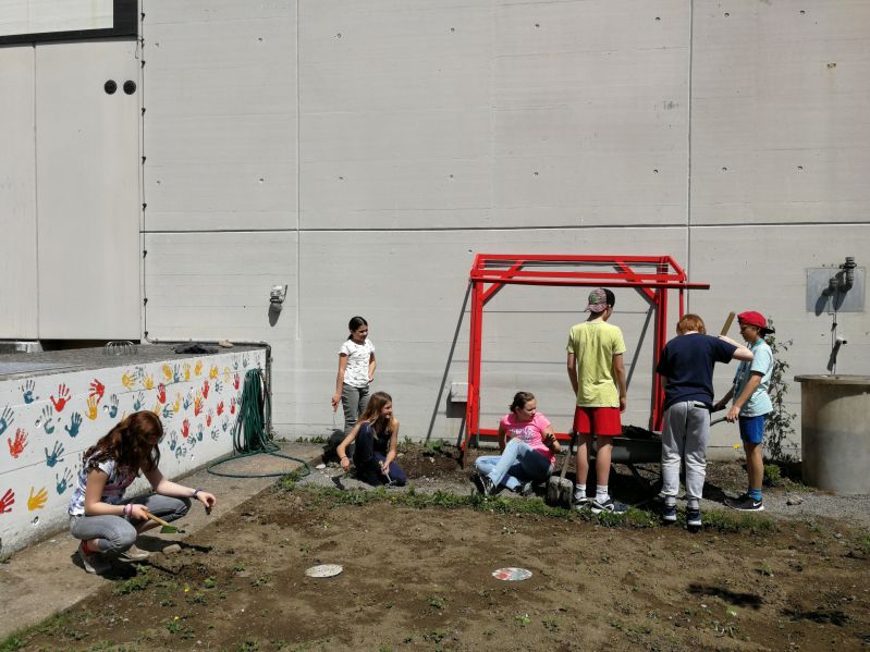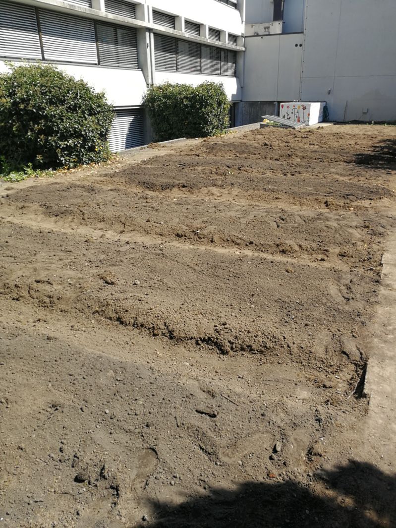 Am 14. März fiel der Startschuss: Die Schülerinnen und Schüler der 5b (heute 6b) lernten, wie man in Saatschalen sät. In kleinen Gruppen füllten sie Saatschalen, in der Hoffnung, dass daraus verschiedene Setzlinge entstehen würden: Zucchetti, Kürbis, Rande, Kopfsalat und Erdbeeren. In ihren Gruppen waren sie fürs Hegen und Pflegen der Saatschalen verantwortlich. Gleichzeitig fiel am 21. März dann auch im «Garten» der Startschuss. Es galt, 120m2 Rasenfläche umzugraben. Die Kinder beider Klassen arbeiteten hart und insgesamt ungefähr 7 Stunden, bis endlich anstelle von spröder Rasenfläche nur noch braune Erde zu sehen war.