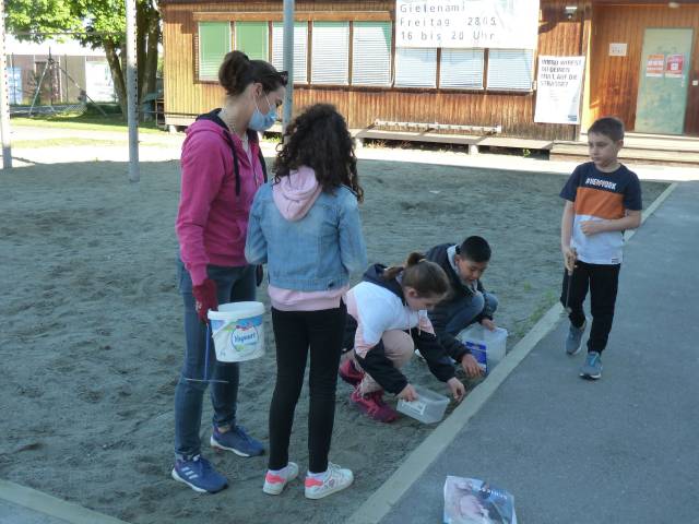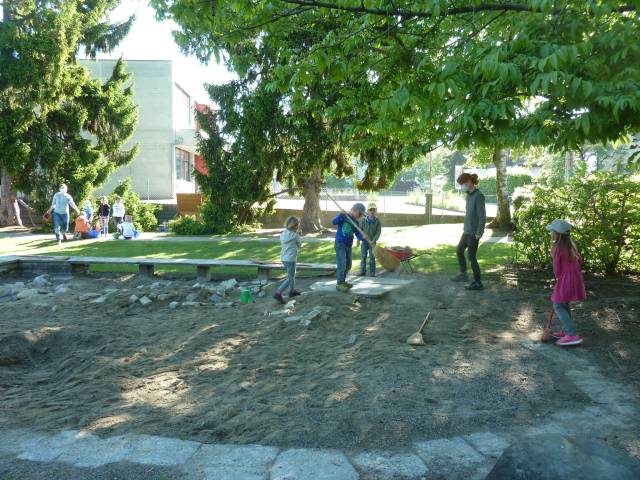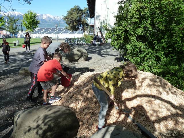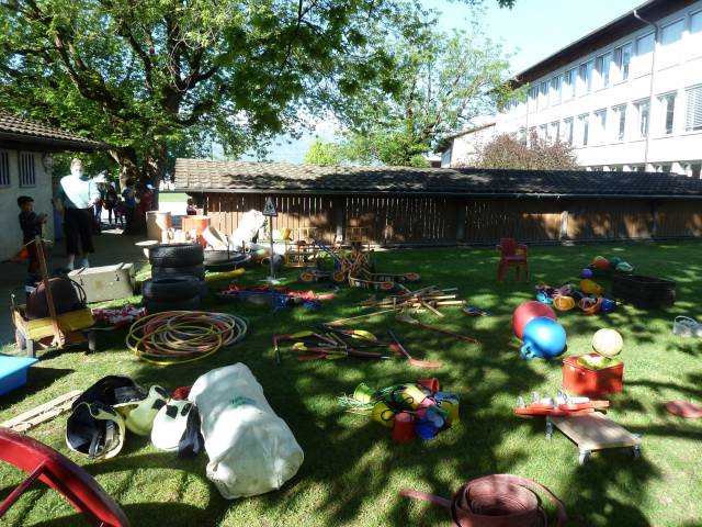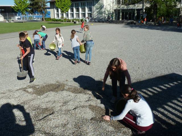 Am Freitag, den 28. Mai fand der diesjährige «Sunnetag» bei strahlendem Wetter statt. Ziel des Vormittags war es, das Schulareal gemeinsam zu pflegen und den Kindern zu vermitteln, dass wir zu den Sachen, die wir regelmässig brauchen, und zu den Orten, an denen wir uns tagtäglich aufhalten, Sorge tragen wollen. Am Morgen versammelten sich die Klassen mit ihren Lehrpersonen auf dem Pausenplatz. Es wurden Kisten ausgeräumt, Material ausgelegt, mit Wasser und Putzlappen geschrubbt und gefegt. Defekte Sachen wurden entsorgt oder geflickt.