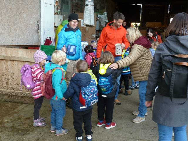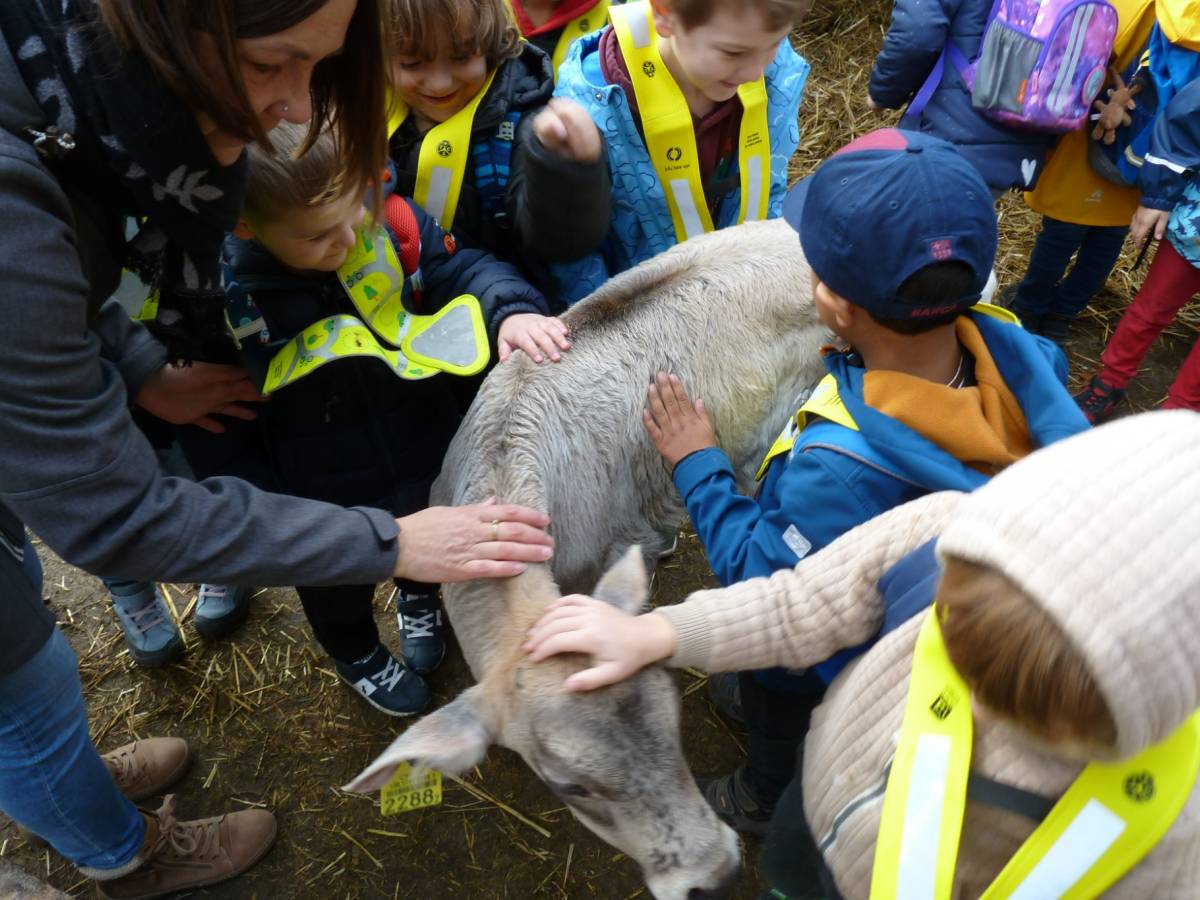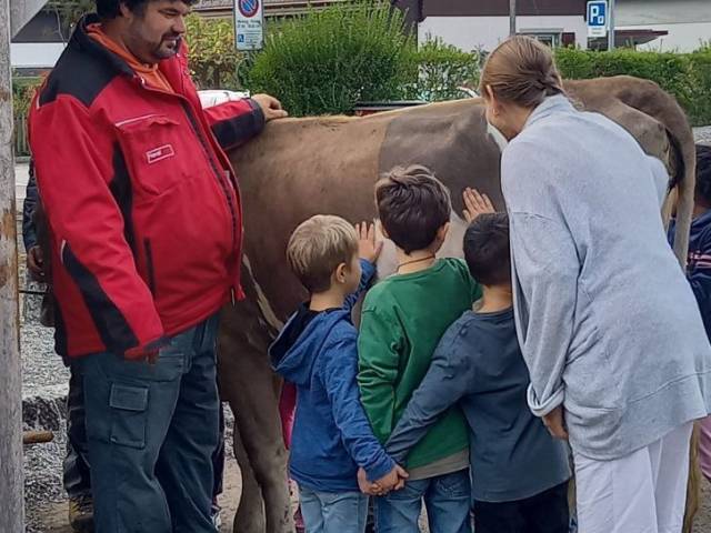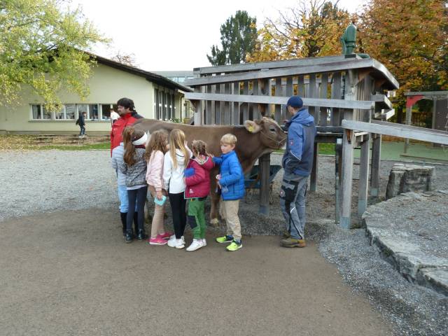 Am Morgen bekommt die Familie Wittwer auf ihrem Bauernhof Besuch von der Schule Bernstrasse und den Kindergärten Bernstrasse und Günzenen. Die Kinder sind aufgeregt und werden von Frau Wittwer in den Stall geführt. Dort gibt es die ausgewachsenen Kühe zu bestaunen, die gemütlich nebeneinander stehen und liegen. Unter der fachkundigen Begleitung von Frau Wittwer kann jedes Kind eine Kuh streicheln und hautnah erleben. Auch draussen halten sich die friedlichen Tiere gerne in ihrem Laufstall auf und die Kälbchen beschnuppern neugierig die Hände ihrer kleinen Besucher.