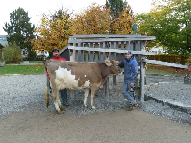 Währenddessen führt Herr Wittwer seine Kuhdame "Atlanta" am Strick zum Schulhaus Sonnenfeld. In der grossen Pause dürfen die Kinder aus der Primarschule und den zugehörigen Kindergärten das grosse, sanfte Tier von allen Seiten betrachten und streicheln.
