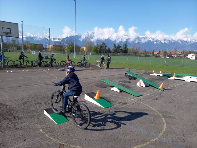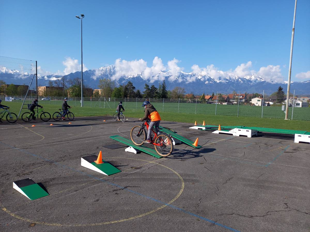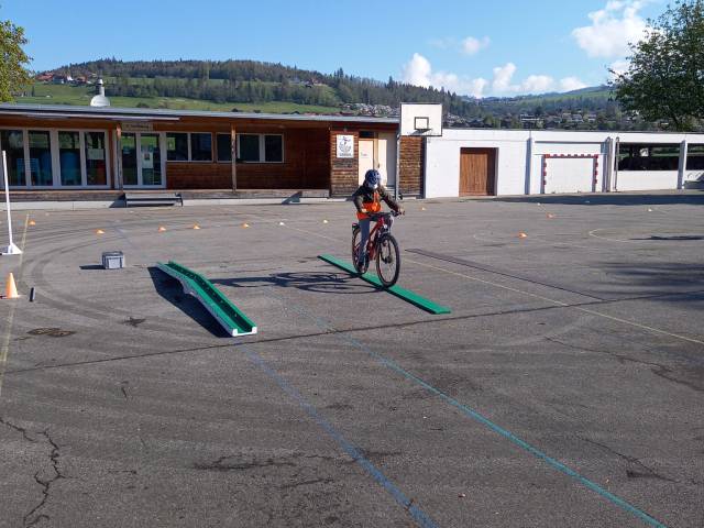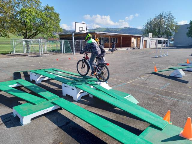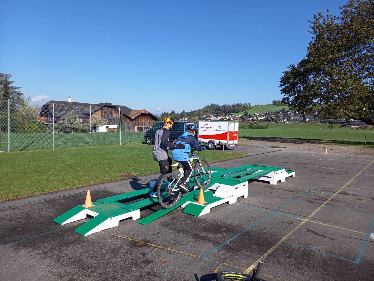 Es handelt sich dabei um einen spielerischen Geschicklichkeitsparcours für junge Velofahrerinnen und Velofahrer im geschützten Raum. Die Lernenden fuhren gewagt über Wippen und Podeste.